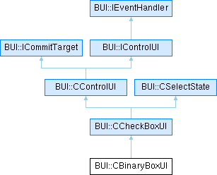 类 BUI::CBinaryBoxUI 继承关系图:Public 成员函数 | |