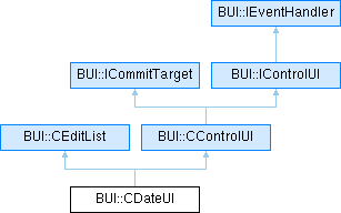 类 BUI::CDateUI 继承关系图:Public 成员函数 | |
